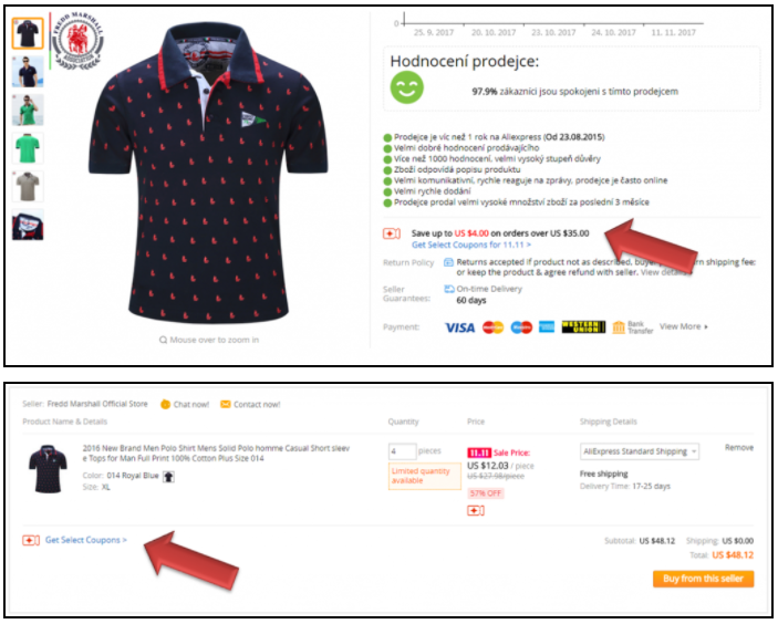 V obchode predajcu si vyberte tovar, ktorý si chcete nakúpiť. Kupóny od predajcov je možné použiť iba na tovar v jeho obchode. V prípade, že nemáte žiadny kupón a páči sa Vám nejaký tovar, tak na obrázku vidíte riadok Store Promotion. Tu vidíte ponuku kupónov od daného predajcu. My už kupón máme, takže si pridáme tovar do košíka. Nezabudnite, že niektoré kupóny môžete použiť až po nakúpení stanovenej čiastky. Napríklad pre použitie US $ 5 kupónu musíte nakúpiť najmenej za US $ 99.